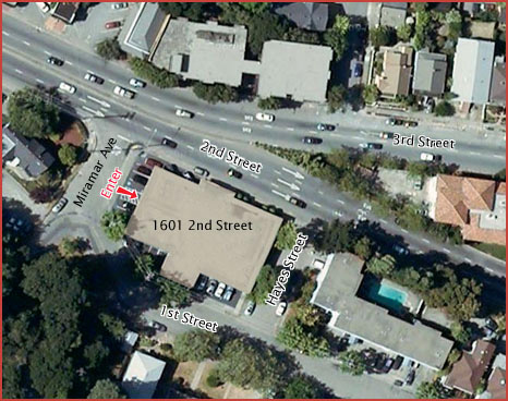 Parking is free at the building. Please enter building on the Miramar Ave. side, and come through the iron gate to the walkway.